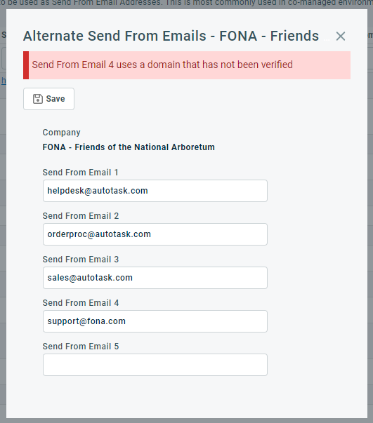 However, if you operate in a co-managed environment where you perform services for clients on behalf of third parties, it is desirable for notification emails to appear to come from a different "Send From" email address. This issue is addressed with Alternate Send From Email Addresses. You can define to five additional "Send From" email addresses per customer.