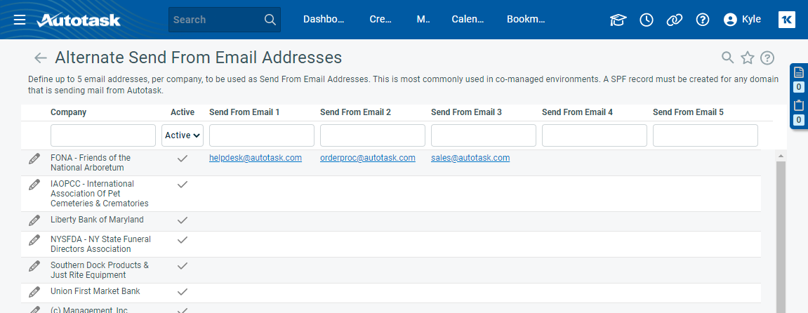 The Alternate Send From Email Addresses page is a search table that lists all organizations in your Autotask instance. To open the page, use the path(s) in the Security and navigation section above.