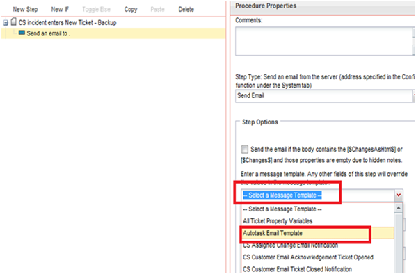- Select "Autotask Email Template" from the Select Message Template menu. This is the template you created.