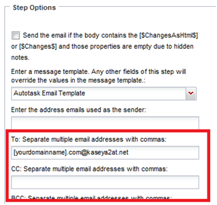 - Under Step Options, enter the email address for your email parser, for example, Kaseya2AT, in the To: field.