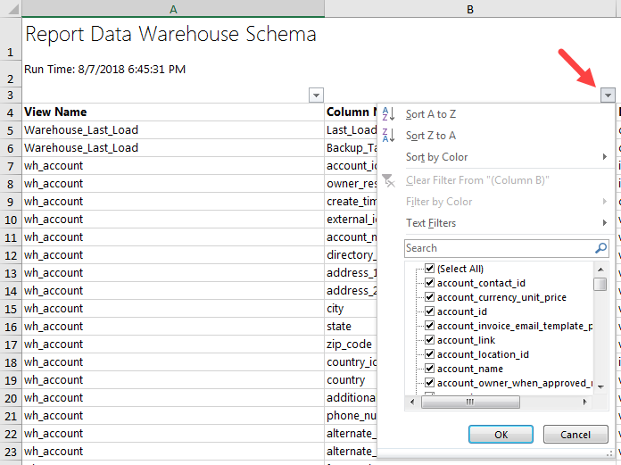 - Column Name is similar to the actual field in Autotask. Many fields have an ID value, then a corresponding definition elsewhere for the name of that value. For example, a view may contain a column name account_id but not the name of the account. So you could use the value for account_id to link back to the view wh_account which would contain the column account_name. In SQL, this is called a table join.