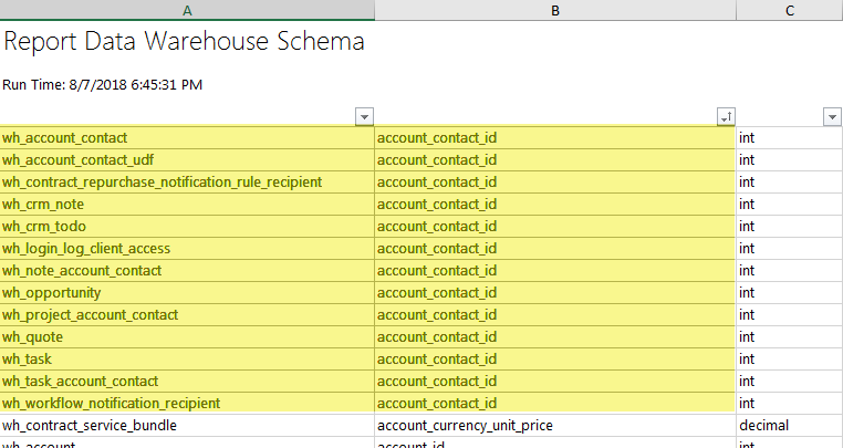 - View Name is similar to the entity described in Autotask. There may be several views that collectively would provide a complete picture of that object in Autotask. For example, the view wh_account contains a column account_id, which could join with other views that contain additional information such as wh_account_contact, wh_account_invoice_email_template_preference, wh_account_udf, etc.