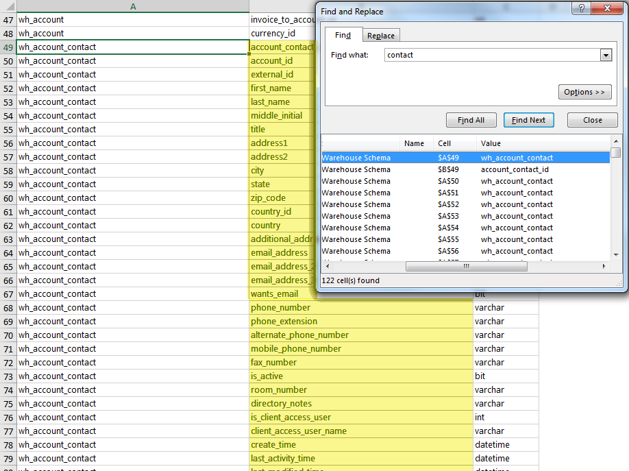 A list of all rows that contain the values entered in the find field opens in the bottom of the Find and Replace Dialog.